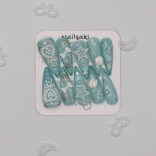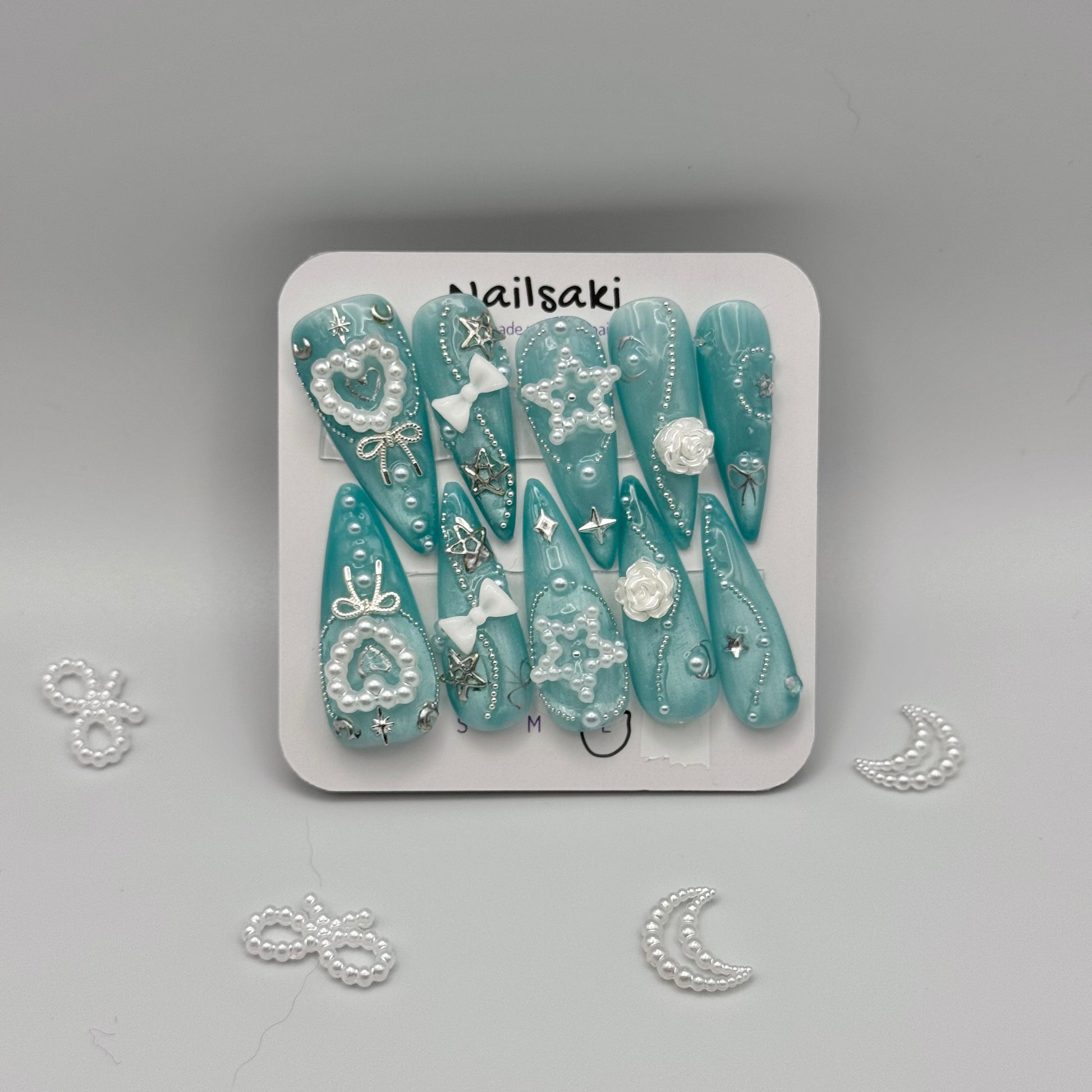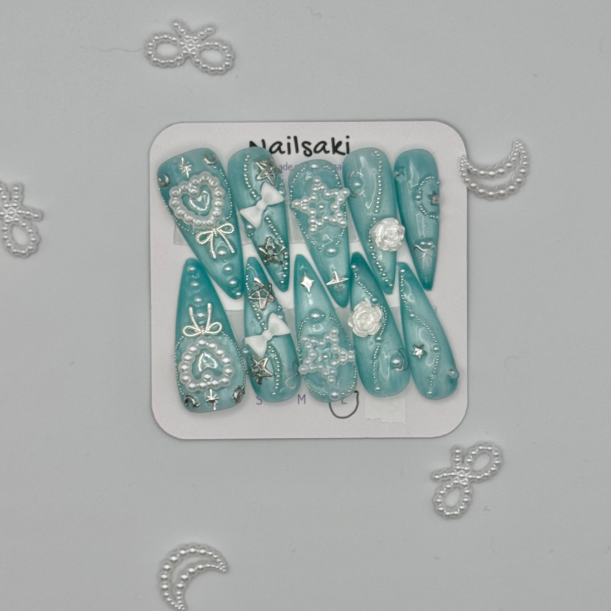 Blue cat eye background, decorated with silver-white-pearl charms